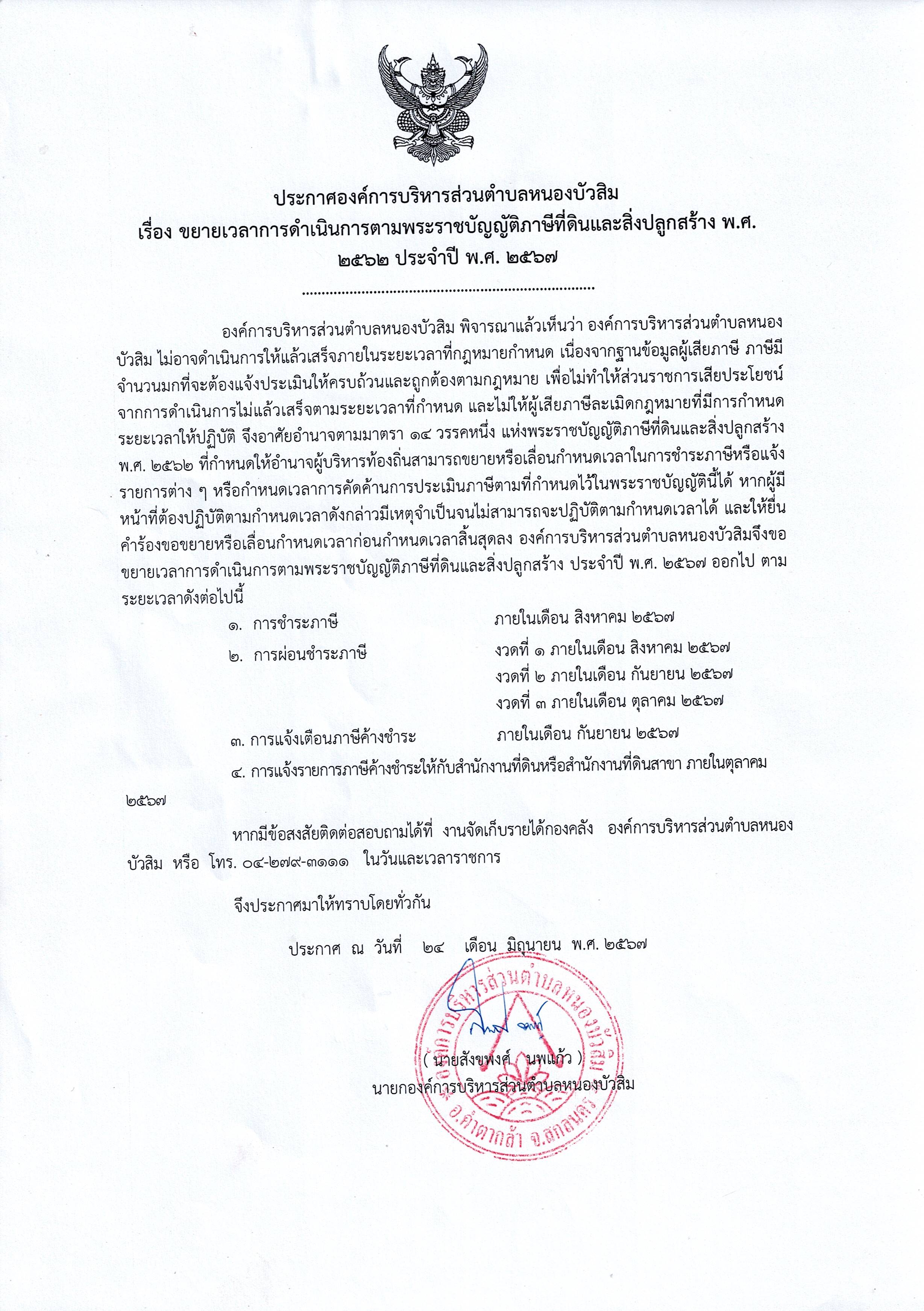 ประกาศ เรื่อง ขยายเวลาการดำเนินการตาม พ.ร.บ. ภาษีที่ดินและสิ่งปลูกสร้าง พ.ศ.2562 ประจำปี พ.ศ. 2567